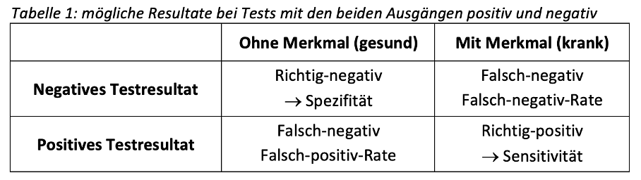 Für medizinische Tests, welche positiv oder negativ ausfallen, gibt es vier mögliche Ausgänge. Zum einen die «Korrekten»: richtig-positiv und richtig-negativ (die Person weist das Merkmal auf und erhält ein positives Testresultat und die Person weist das Merkmal nicht auf und der Test ist negativ). Weiter gibt es auch zwei «falsche Ausgänge»: falsch-positiv und falsch-negativ (vgl. Tabelle 1). Basierend auf diesen vier Möglichkeiten gibt es für die Aussagekraft von medizinischen Tests zwei einschlägige Parameter, die Sensitivität und die Spezifität.
