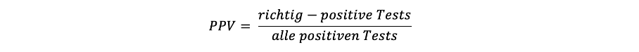 Positiver Vorhersagewert Nun werden die obigen drei Teile zusammengesetzt, denn der Positive Vorhersagewert oder auch positive predictive value (PPV) liefert die Antwort zur Frage, wie gross die Wahrscheinlichkeit erkrankt zu sein ist, wenn der Test positiv ausfällt. Der PPV ist die Anzahl Personen, welche positiv getestet wurden und tatsächlich das Merkmal aufweisen (richtig-positive Tests), gemessen an der Gesamtanzahl der positiven Tests (egal, ob die Person das Merkmal aufweist oder nicht). Ideal wäre ein PPV von 1, denn dies bedeutet, dass alle Personen, welche ein positives Testresultat erhalten auch tatsächlich das Merkmal aufweisen.