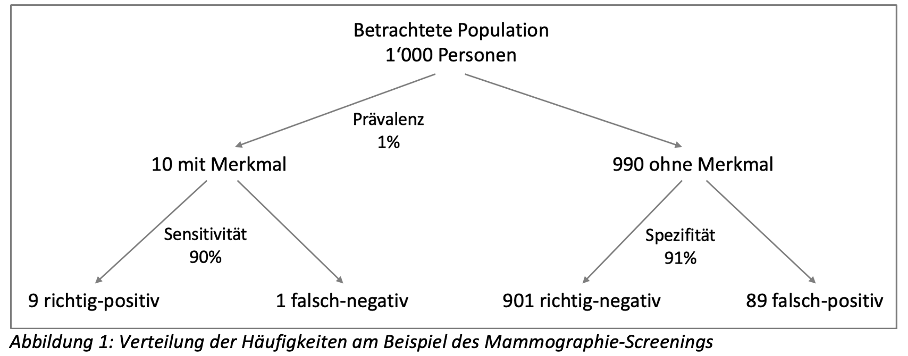 Um die Anzahl richtig-positiver Tests zu erhalten, wird die Gesamtmenge der teilnehmenden Personen mithilfe der Prävalenz in eine Gruppe von Personen mit Merkmal und solche ohne unterteilt. Anschliessend wird in der Gruppe der Personen mit Merkmal mit der Sensitivität berechnet, wie viele dieser Personen auch tatsächlich als mit Merkmal beziehungsweise erkrankt erkannt werden (positives Ergebnis). Angewendet auf das Mammographie-Beispiel ergibt das folgendes: Die Prävalenz liegt bei 1% und wir betrachten eine Population von 1'000 Frauen. Somit sind 10 Personen an Brustkrebs erkrankt. Die Sensitivität des Tests liegt bei 90%. Daraus folgt, dass 9 dieser 10 Personen korrekt als erkrankt erkannt werden (siehe auch Abbildung 1). Dies ist die Anzahl der richtig-positiven Testresultate.