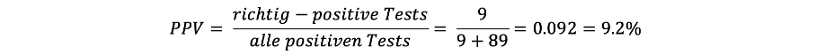 Der Positive Vorhersagewert liegt somit bei rund 9%. Dies bedeutet, dass lediglich etwa 1 von 10 beim Mammographie-Screening positiv getesteten Personen tatsächlich an Brustkrebs erkrankt sind. Erstaunlich, nicht?