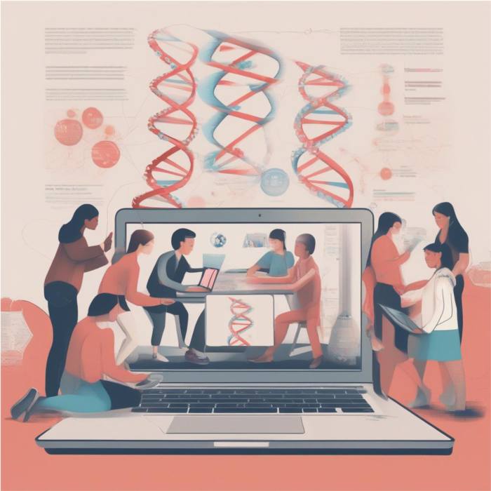 The image was generated using Stable Diffusion XL Base 1.0 and the prompt: "Several people from all over the world using a laptop which shows DNA""