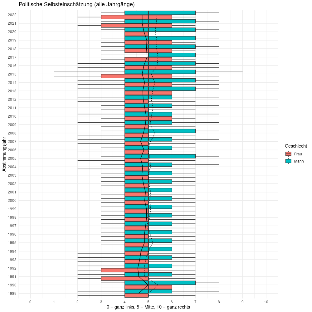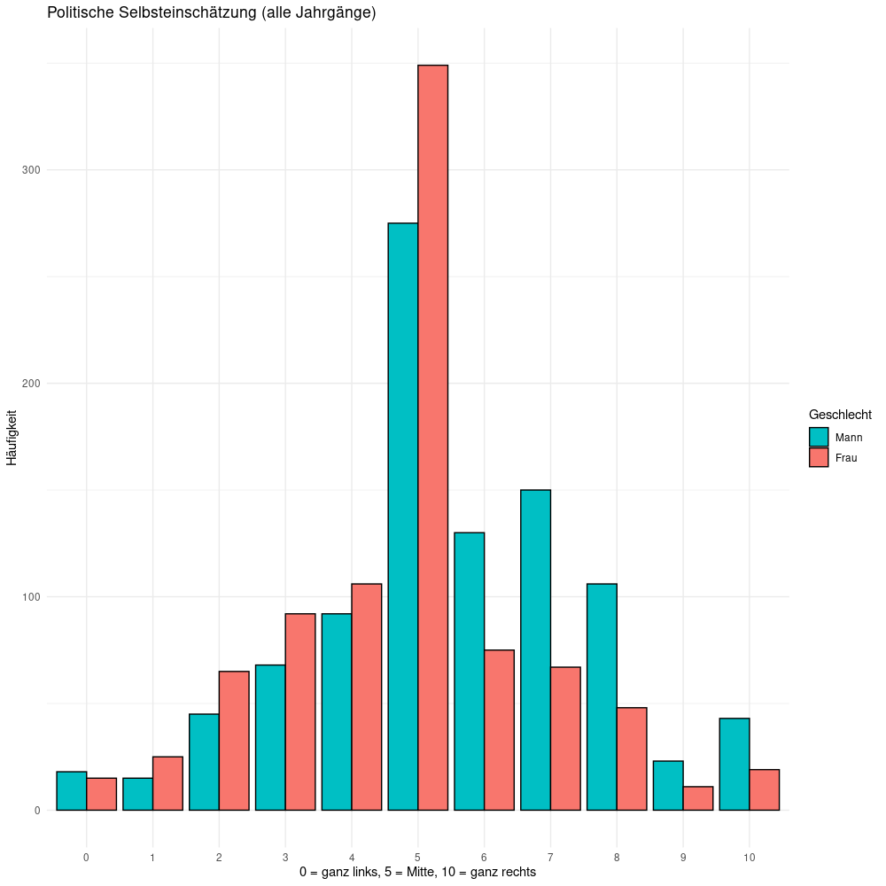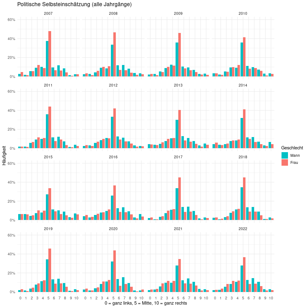 Die obigen beiden Abbildungen basieren auf denselben Daten wie die vorangehenden zwei Grafiken, zeigen aber für jedes Jahr die zugrundeliegenden Häufigkeitsverteilungen. Diese geben an, wie häufig ein bestimmter Wert innerhalb Stichprobe vorkommt. Die obigen Abbildungen zeigen beispielsweise gut, dass in jedem Jahr der häufigste Wert die 5 war – sowohl bei Männern wie auch bei Frauen. Beim Blick auf diese Häufigkeitsverteilungen verschwindet der postulierte Graben wieder, weil deutlich wird, dass die Verteilungen der politischen Einstellungen von Frauen und Männern stark überlappen.