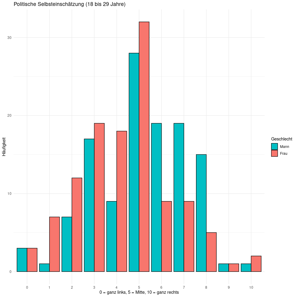 Die obige Grafik zeigt die Verteilung der politischen Selbsteinschätzung derjenigen Männer und Frauen, die im Nachgang an die Abstimmung über das AHV-Gesetz vom 25. September 2022 befragt wurden [5]. Wenn man den Fokus nur auf die jüngere Generation legt (18 bis 29 Jahre), ergibt sich ein ähnliches Muster.