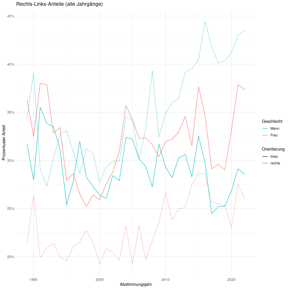 Die Entwicklung der prozentualen Anteile rechts und links der Mitte bei Frauen und Männern basierend auf der politischen Selbsteinschätzung bei Abstimmungsbefragungen (Quellen: [6][7]). Als «links» wurden Werte von 0 bis 4 gezählt, als «rechts» Werte von 6 bis 10.