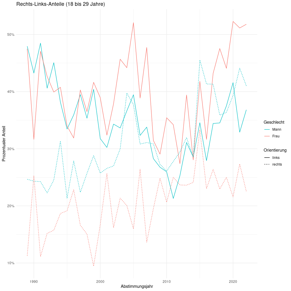 Die Entwicklung der prozentualen Anteile rechts und links der Mitte bei jungen Frauen und Männern (18 bis 29 Jahre) basierend auf der politischen Selbsteinschätzung bei Abstimmungsbefragungen (Quellen: [6][7]). Als «links» wurden Werte von 0 bis 4 gezählt, als «rechts» Werte von 6 bis 10.