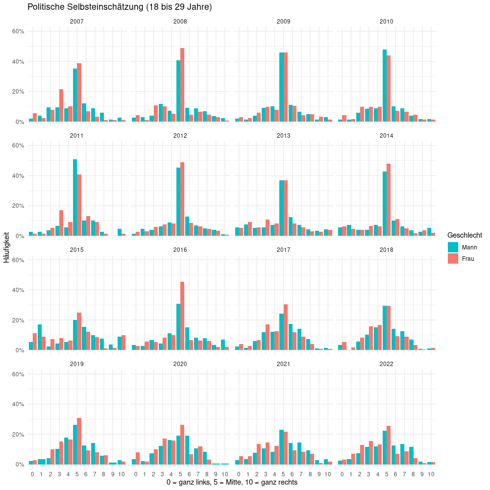 Die Häufigkeitsverteilungen der politischen Selbsteinschätzung von jungen Frauen und Männern (18 bis 29 Jahre) seit 2008 (Quellen: [6][7]). Auch hier zeigt sich in jedem Jahr eine starke Überlappung der Verteilungen. Was jedoch bei beiden Geschlechtern auffällt, ist eine Abwanderung zu Werten leicht rechts und links der Mitte. Dennoch bleibt der häufigste Wert die 5.