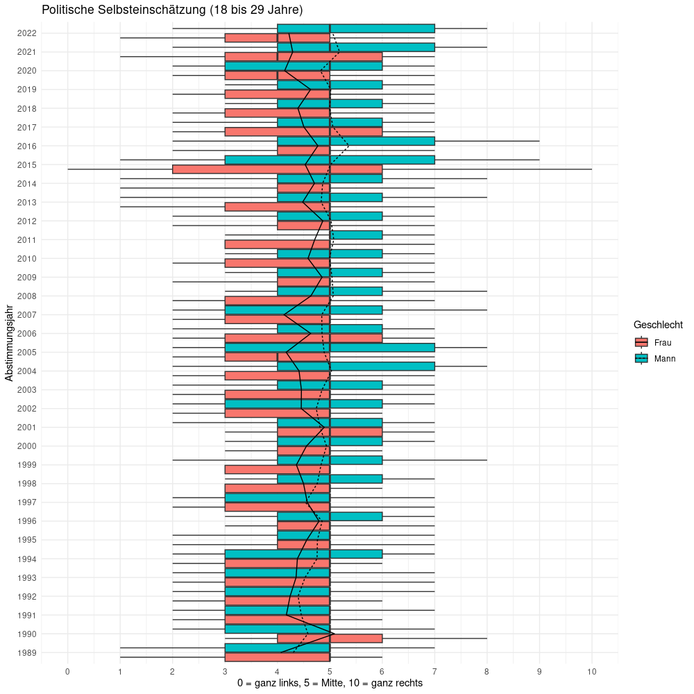 In dieser Darstellung sind junge Frauen tatsächlich tendenziell nach links, junge Männer tendenziell nach rechts gewandert. Es zeigt sich aber ebenso, dass junge Männer seit 2010 nicht nur nach rechts, sondern auch nach links gewandert sind. Das klingt widersprüchlich, heisst aber letztlich nur, dass sie in den letzten Jahren statt einer 5 (= Mitte) vermehrt etwas anderes als eine 5 angegeben haben.